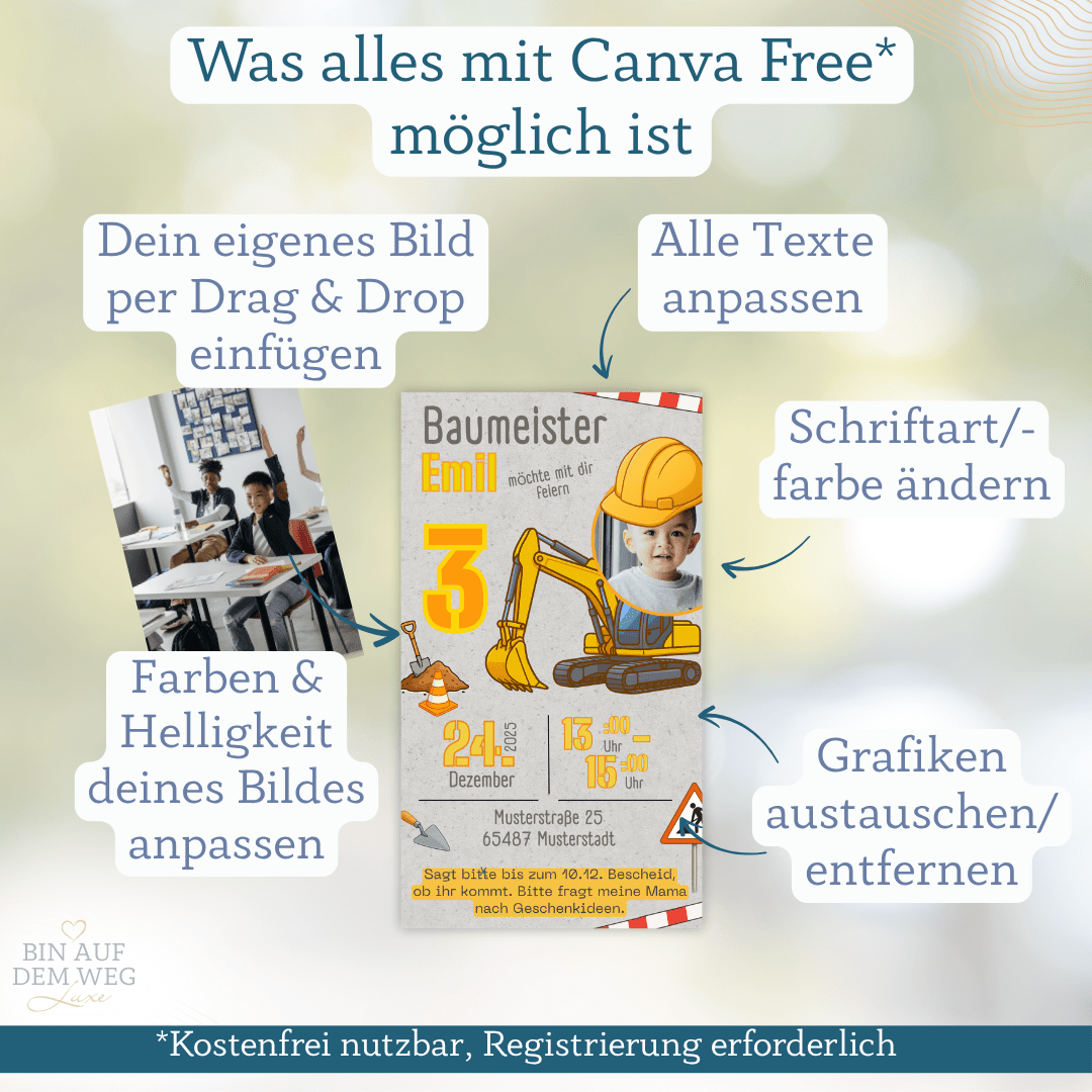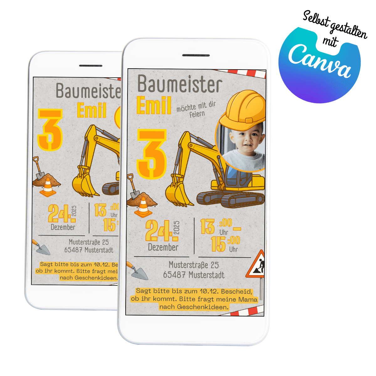 Digitale Einladung Baustelle für kleine Baumeister – perfekt für Jungs und Kleinkinder. Zwei Designs (mit & ohne Foto), selbst anpassbar in Canva.