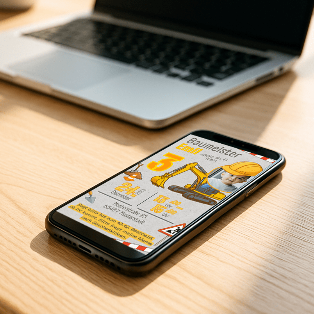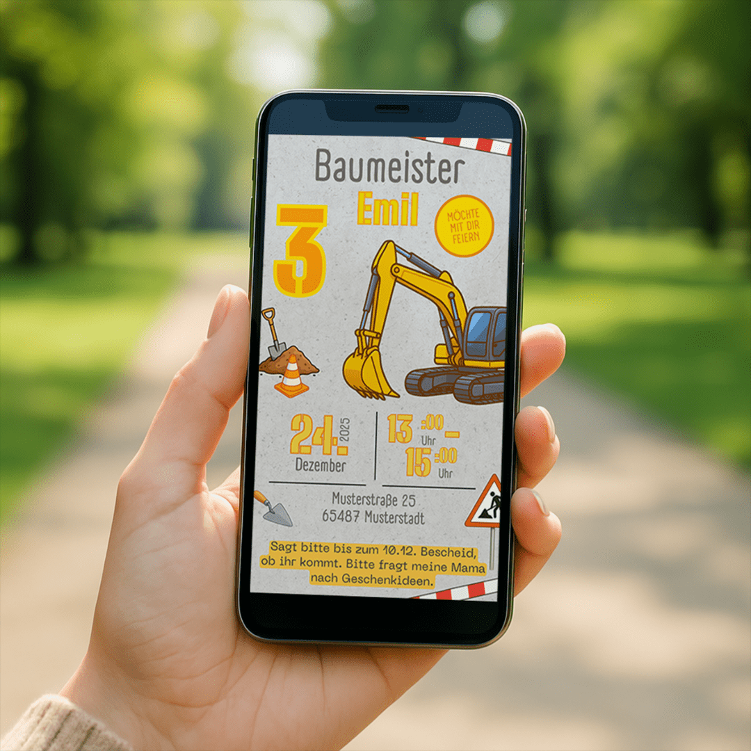 Hier wird gebuddelt, gebaut und gefeiert! Diese Einladung Baustelle ist wie gemacht für kleine Bauleiter, die ihre Gäste mit Helm und guter Laune empfangen wollen.