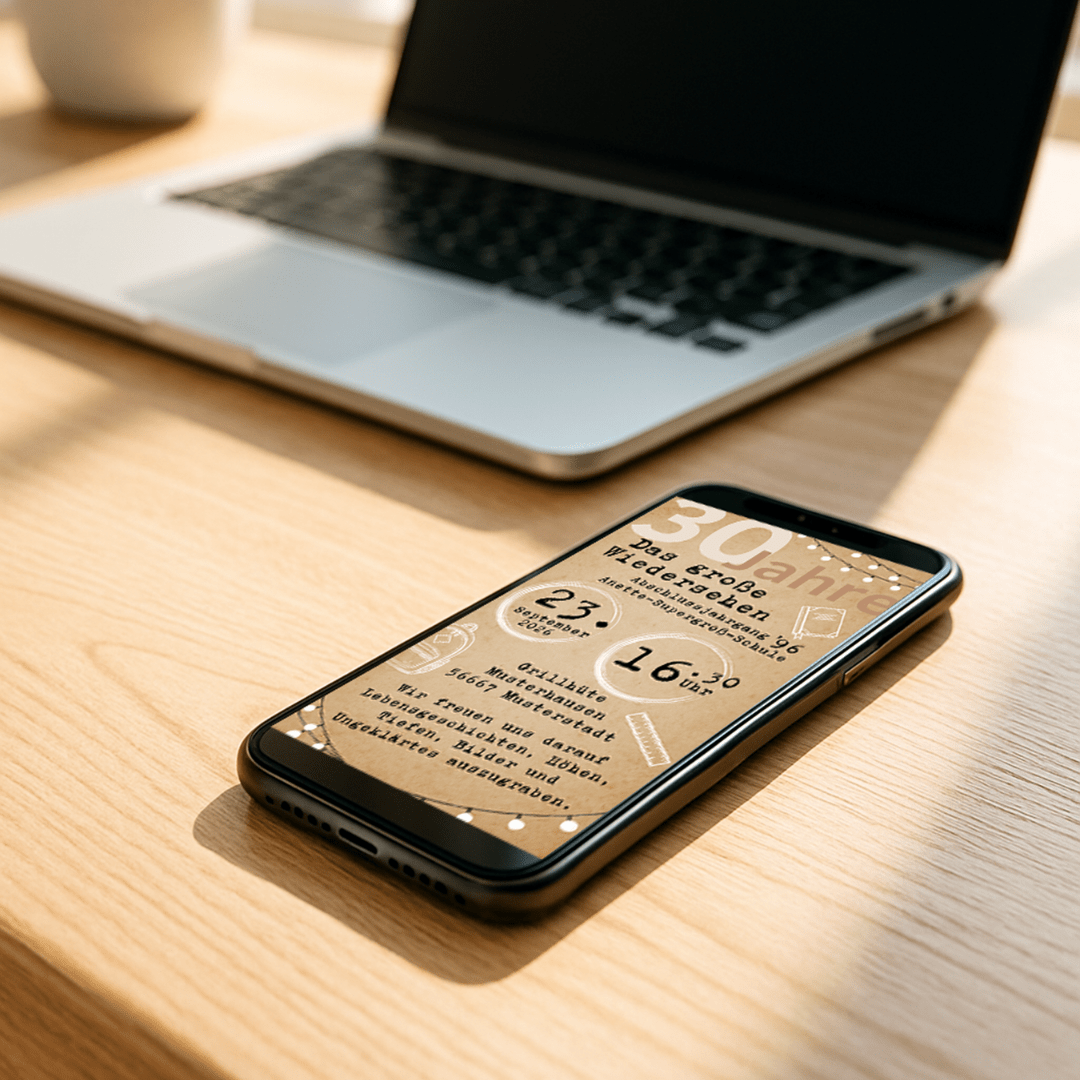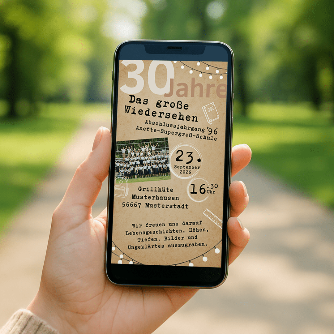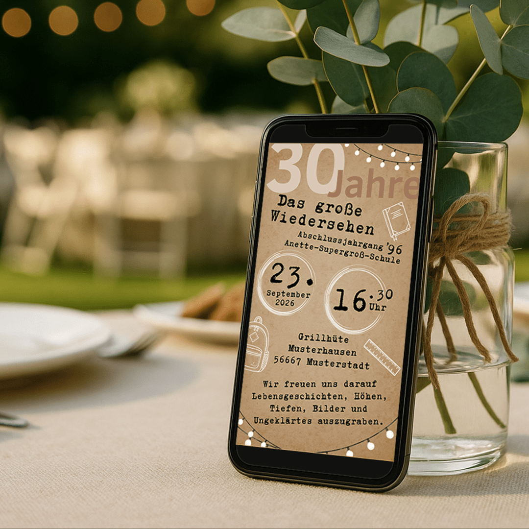 Ein Hauch Nostalgie, ein bisschen Humor und jede Menge Wiedersehensfreude – diese Einladung bringt euer Klassentreffen perfekt auf den Punkt! 🥂