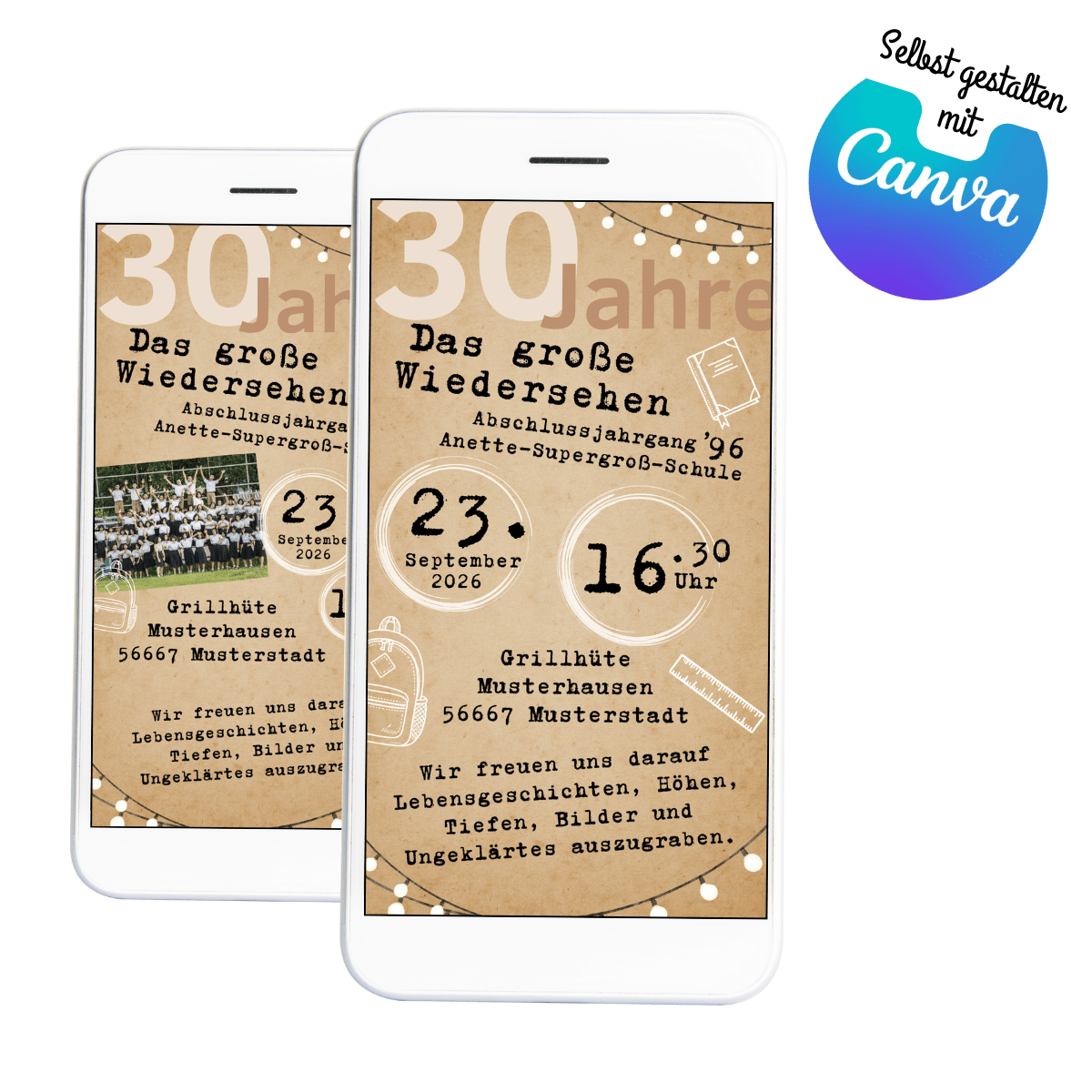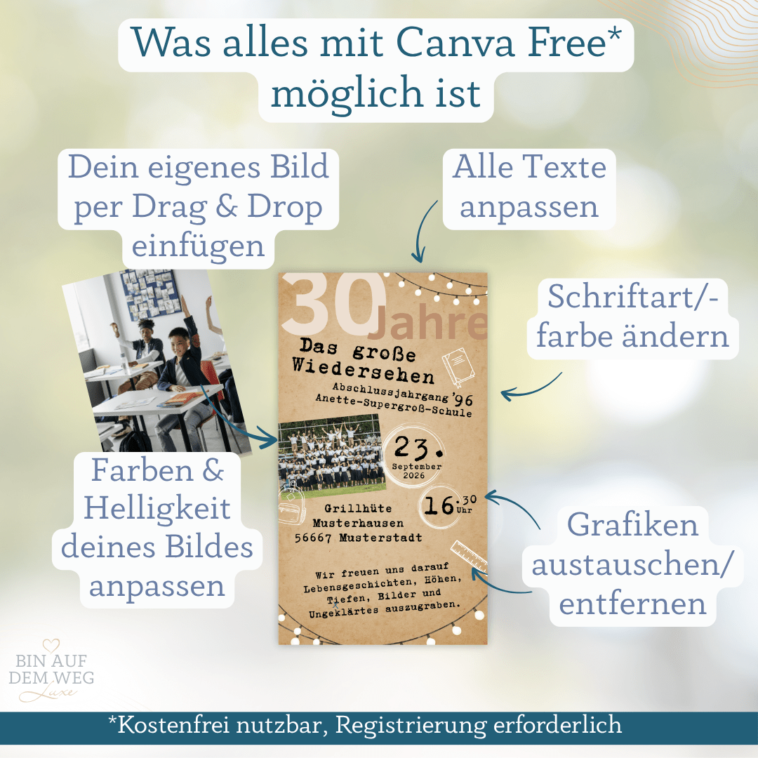Mit der Canva-Vorlage kannst du ganz einfach alles selbst anpassen: Jahrgang, Schule, Datum, Uhrzeit, Ort oder sogar ein altes Klassenfoto.