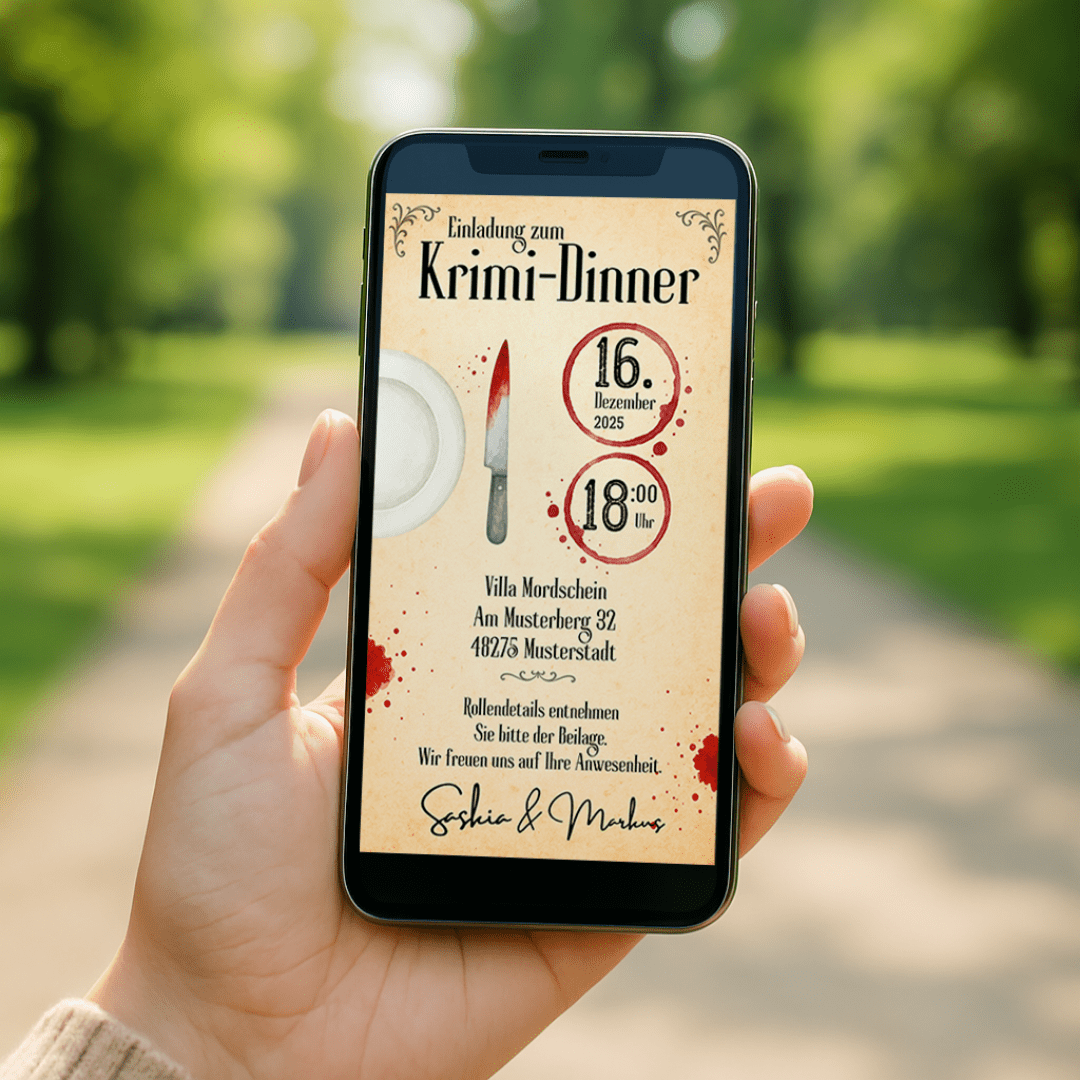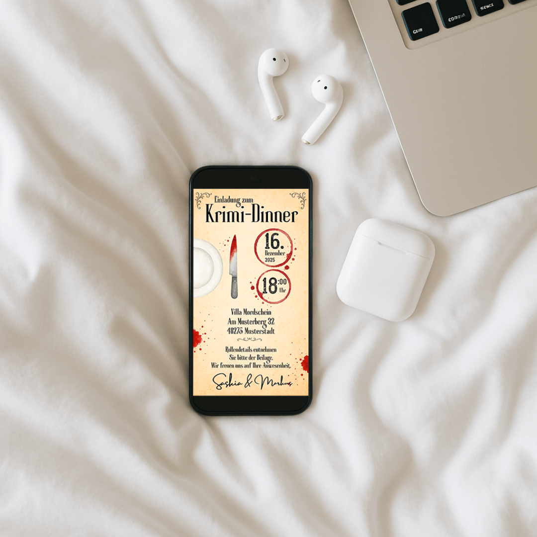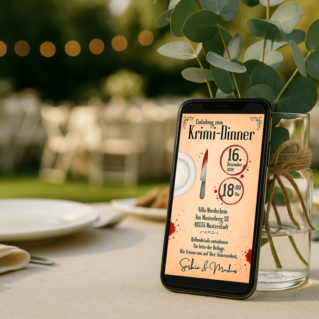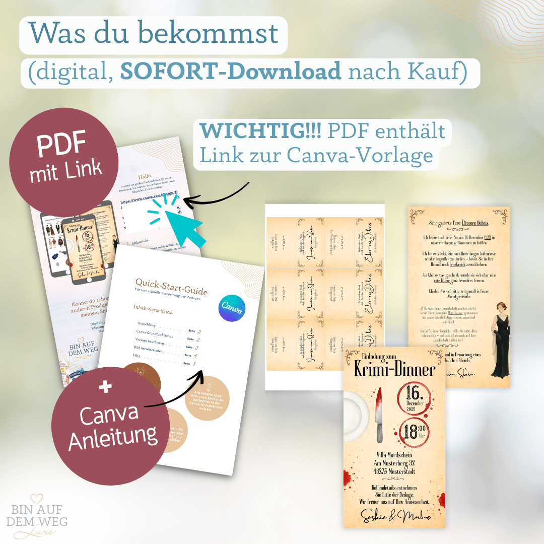 Dieses liebevoll gestaltete Set ist perfekt für dein eigenes Krimidinner – inklusive Einladung, individueller Rollenbeschreibung mit Dresscode-Beispiel und doppelseitigen Tischkärtchen für jeden Gast.