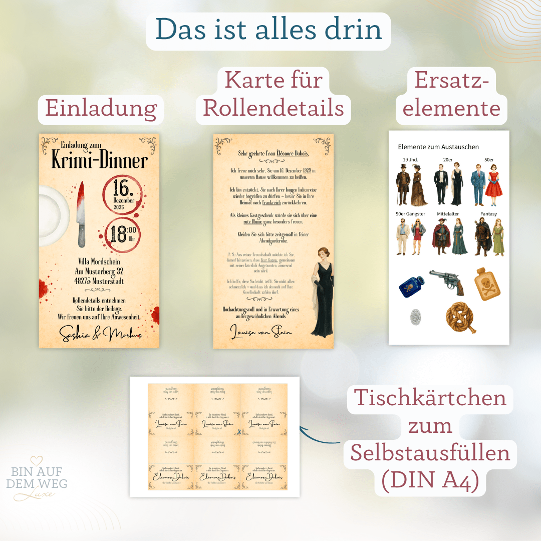 🎭 Enthält Einladung, Rollenblatt, doppelseitige Tischkarten & Extra-Grafikbogen