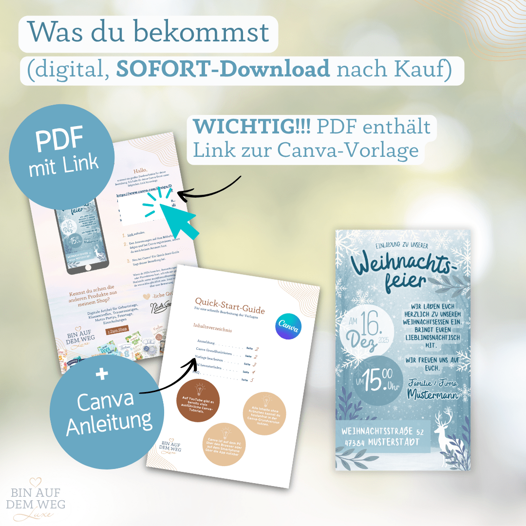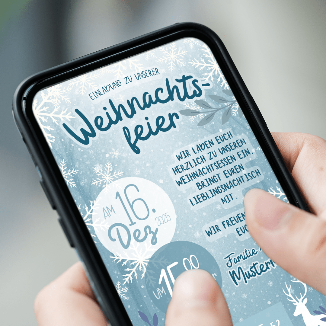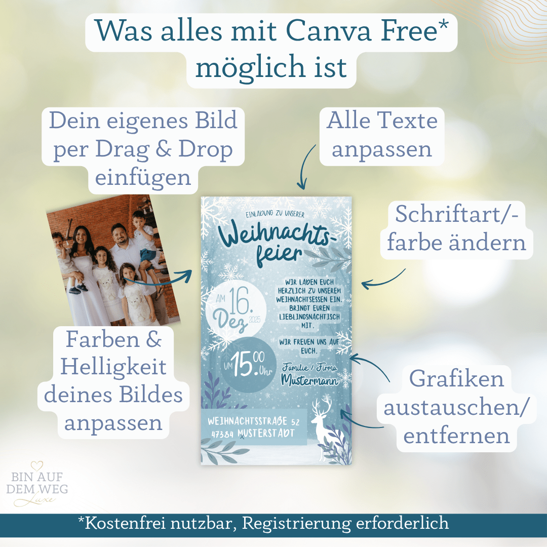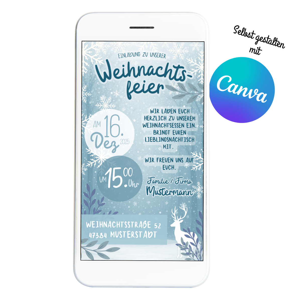 Digitale Einladung zur Weihnachtsfeier mit liebevollem Winterdesign. Einfach in Canva bearbeiten, speichern und per WhatsApp oder E-Mail verschicken.