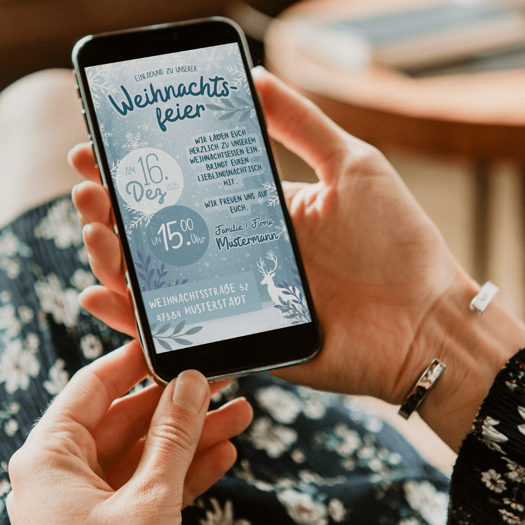 Diese liebevoll gestaltete digitale Weihnachtsfeier-Einladung bringt winterliche Eleganz auf den Punkt: zarte Schneeflocken, feine Äste, eine elegante Hirsch-Silhouette und ein Hauch festlicher Ruhe. ❄️
