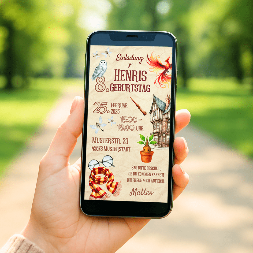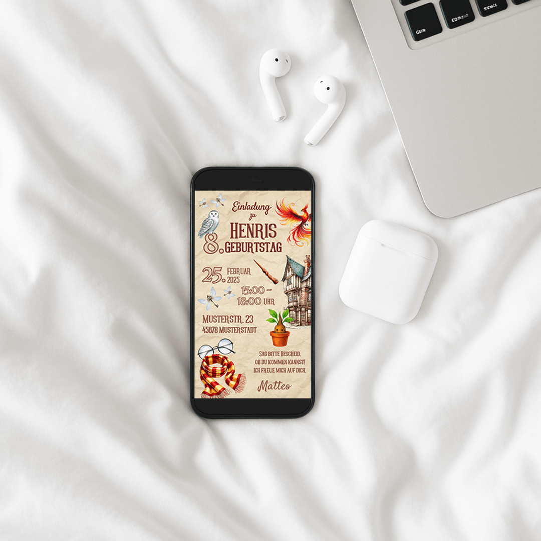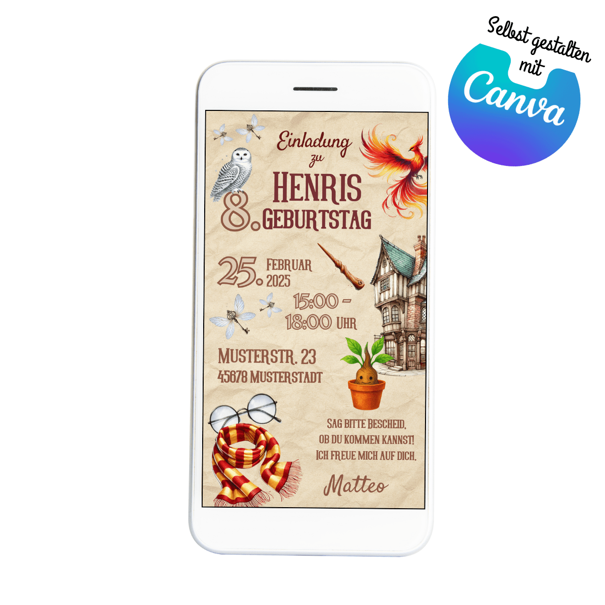 Diese Einladung bringt Magie, Freude und ein bisschen Zauberschul-Flair in jede Geburtstagspost.