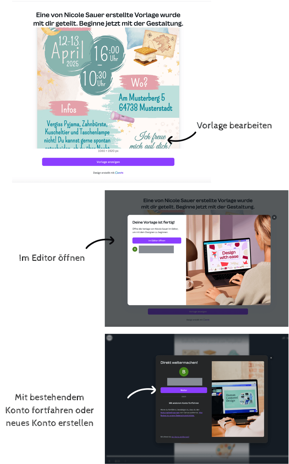 Je nach Browser in dem sich der Link öffnet, kann es unterschiedlich aussehen. Bevor du deine Vorlage nutzen kannst, brauchst du ein (kostenloses!) Konto bei Canva.